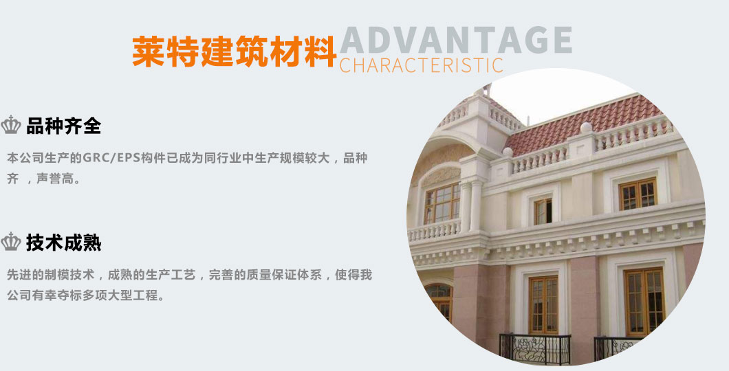 EPS/GRC產品是目前主導外墻裝飾的新型綠  色 環(huán) 保材料。較預制模板繁瑣的施工程序和高額的施工成本,更適用于安裝于外墻EPS,XPS保溫的墻體上。即能體現歐式、古典、高雅的裝飾風格,又能保 證主體建筑外墻不出現冷、熱橋效應。